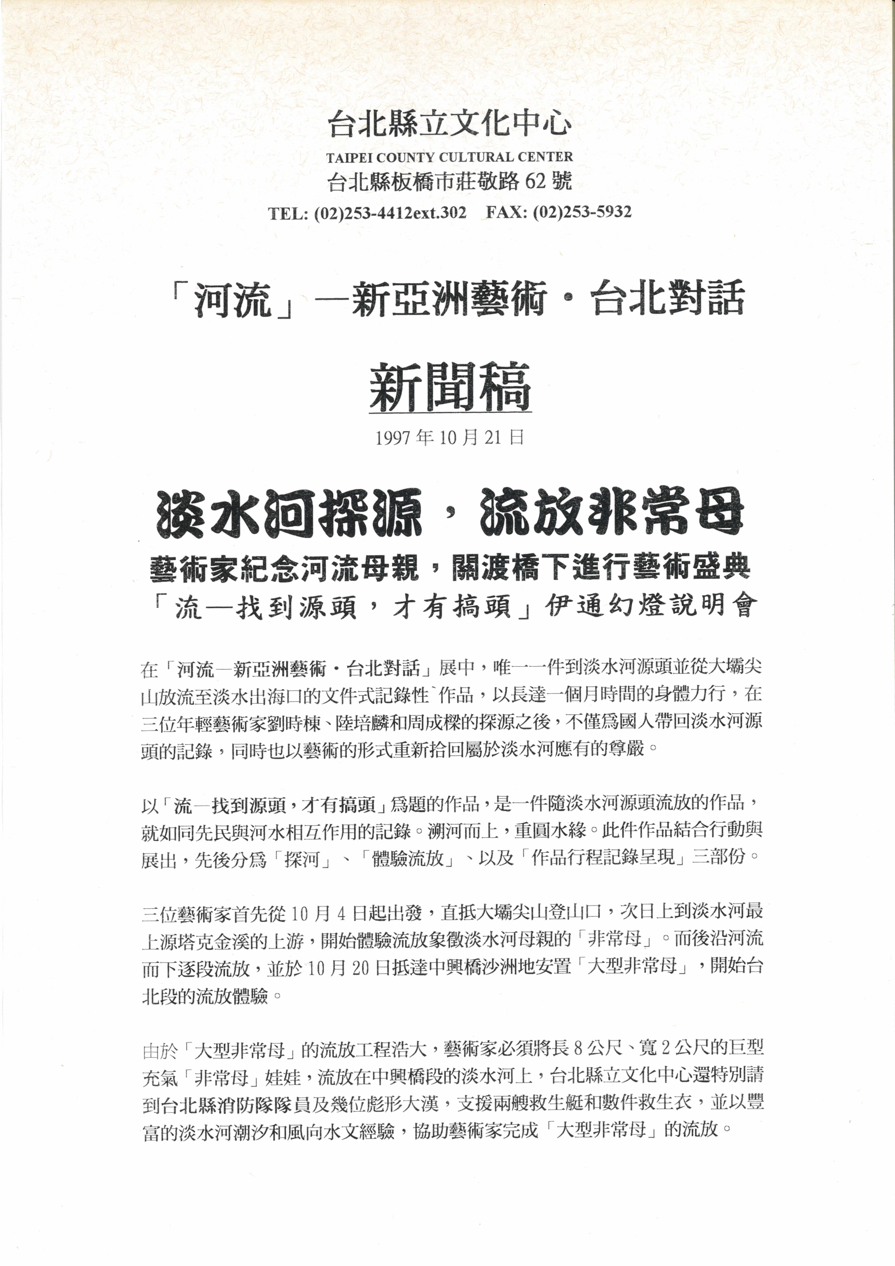 「河流—新亞洲藝術·臺北對話」新聞稿。以「流—找到源頭,才有搞頭」為標題,於伊通公園舉行參展藝術家的幻燈說明會。這是一件從淡水河源頭並從大霸尖山放流至淡水出海口的文件式紀錄性作品,由藝術家劉時棟、陸培麟、周成樑一同執行淡水河源頭探源任務,於10月4日出發抵大霸尖山登山口,並前往塔克金溪上游體驗流放象徵淡水河母親的「非常母」。最終於10月20日抵達中興橋沙洲安置大型「非常母」,並於10月25日、31日舉行解開繫於中興橋橋墩的「非常母」臍帶的流放活動,邀請民眾分別至關渡大橋與淡水河渡船頭觀賞。(陳寬育)